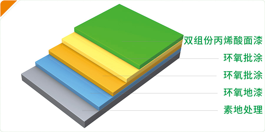 雙組份丙烯酸面漆: 雙組份丙烯酸面漆或止滑面漆滾涂二道,完工后整體表面光亮潔凈,顏色均一;